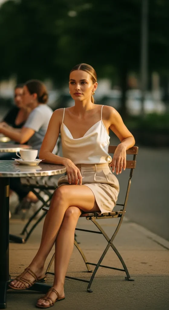 A silky satin slip tank with tailored summer shorts gives a minimalist yet elegant casual Y2K look. Effortless chic for dinners or daytime strolls.
