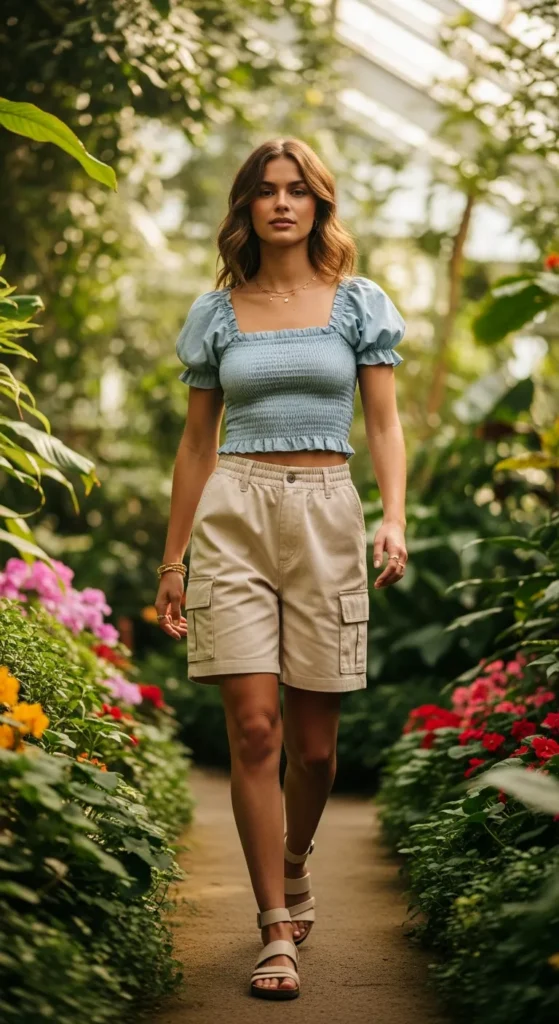 A smocked crop top paired with neutral cargo shorts creates cute summer contrast, balancing fitted and relaxed silhouettes.