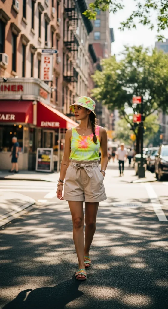 A bright tie-dye tank paired with neutral paperbag shorts gives a relaxed, cheerful vibe perfect for brunch or a sunny stroll. The oversized top tucked slightly enhances casual coolness.