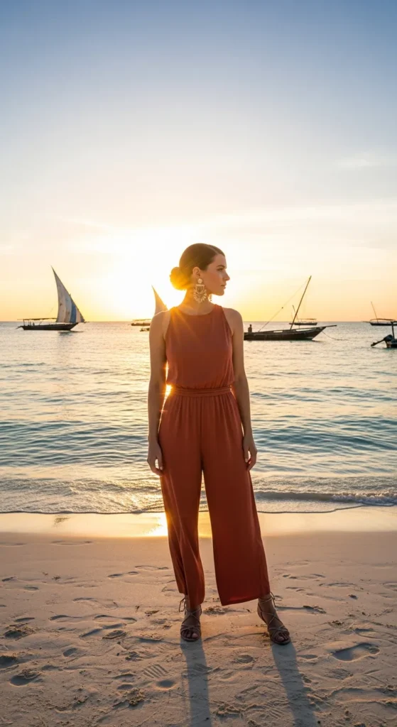 A sleeveless terracotta jumpsuit with a cinched waist feels modern and grounded, perfect for an evening dhow cruise.