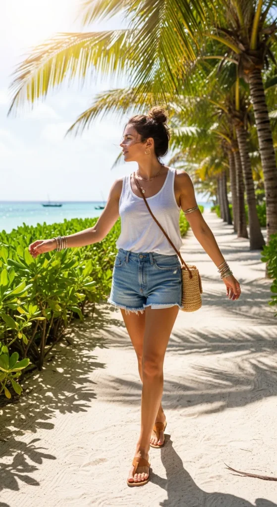 High-rise light denim shorts and a breathable cotton tank feel casual yet intentional for island days.