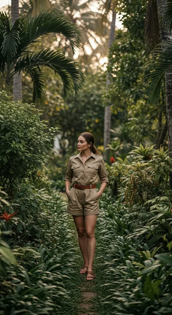 A khaki short-sleeve button-up with matching tailored shorts blends adventure and island charm.