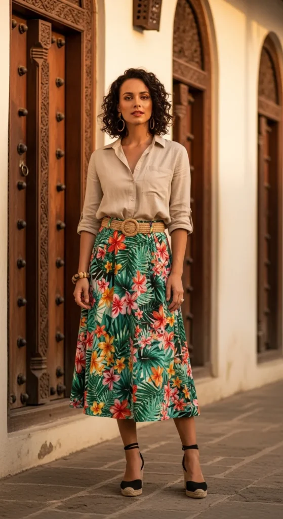 A relaxed sand-colored linen button-down tucked into a tropical printed midi skirt feels balanced between island and elegance. It’s ideal for exploring historic streets without feeling overdressed.