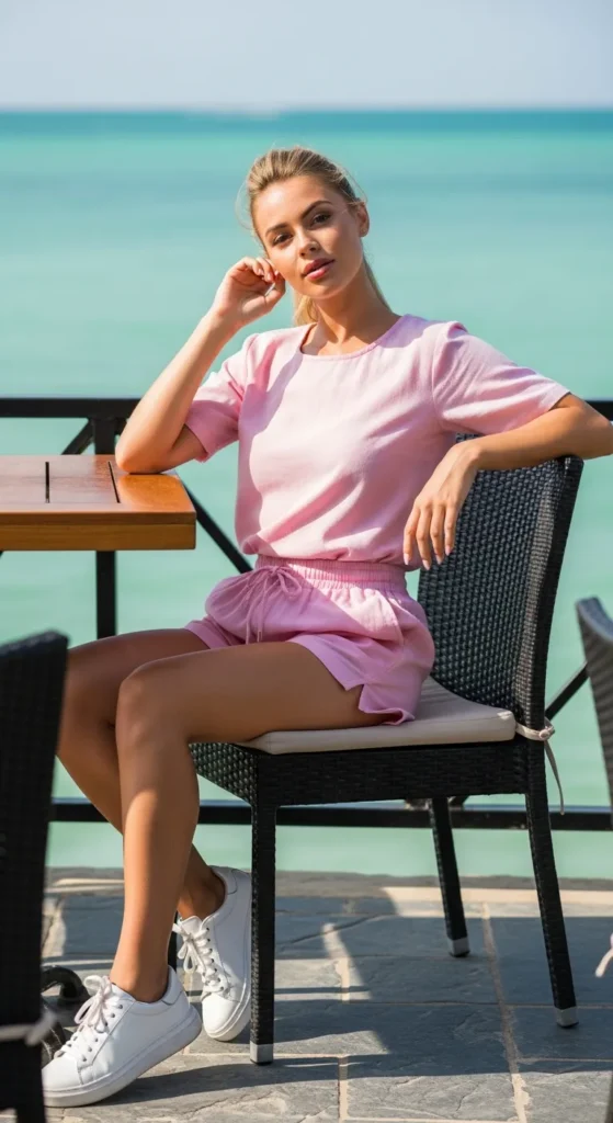 A soft pastel two-piece set with relaxed tailored shorts feels polished yet playful. It’s ideal for café hopping and boat tours.