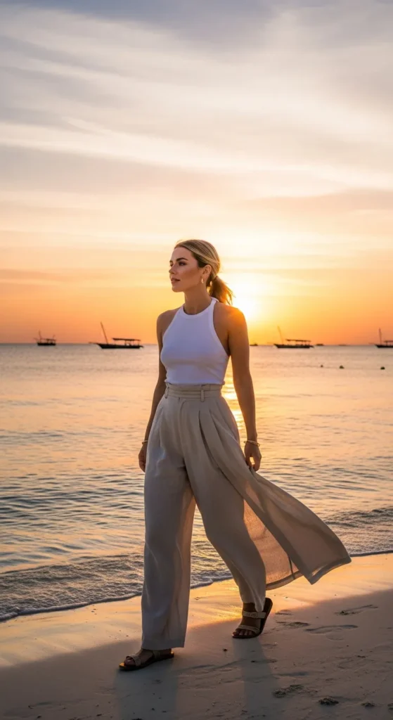 A breezy linen crop top with high-waisted wide-leg pants in soft ivory feels fresh against Zanzibar’s golden sunrise. It’s relaxed yet polished, perfect for morning coffee by the ocean while the island slowly wakes up.