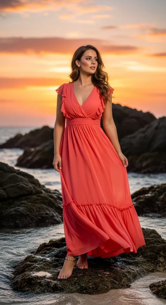 A flowing coral maxi dress that catches the wind feels dramatic yet soft at sunset. The color mirrors the glowing sky, making every photo moment feel intentional and romantic.
