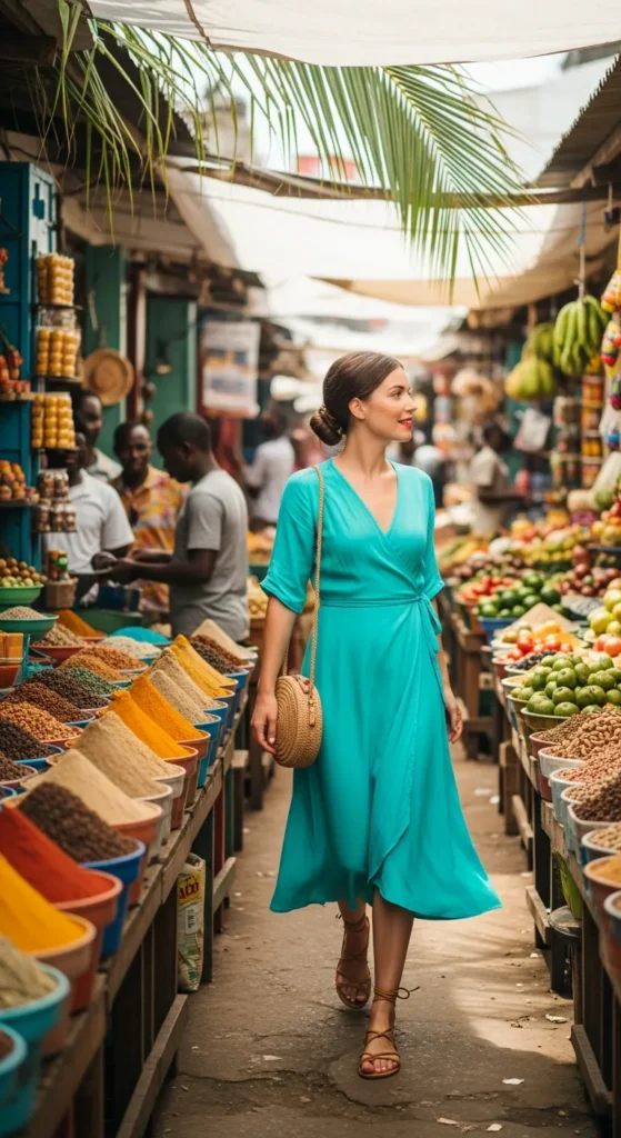 A lightweight wrap dress in ocean turquoise mirrors the surrounding sea while keeping you cool in the spice markets. The adjustable waist flatters naturally and allows easy movement through narrow alleys.