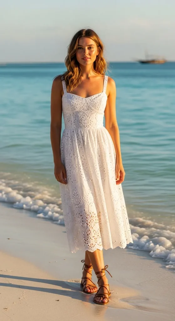 A white eyelet midi dress captures tropical romance while staying breathable in humid weather.